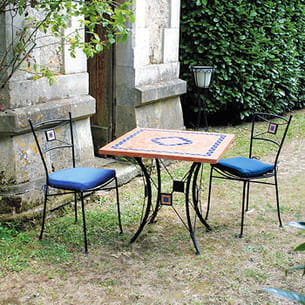 Pour un déjeuner intimiste, quoi de plus approprié que ce petit salon de jardin ? Composé d'un plateau en céramiques émaillées bleues et de pieds en fer forgé galvanisé gris, cet ensemble embellira le plus sobre des jardins. Très pratiques, les chaises sont pliantes.