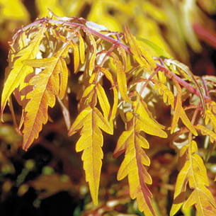 Pour ajouter de la luminosité tout en profitant d'un végétal très ornemental, optez pour ce sumac rhus tiphyna 'Tiger eyes'. Ses tiges duveteuses d'un rose violacé offrent un contraste de toute beauté avec le feuillage de couleur citron. Exposé à la lumière directe, planté dans un substrat bien humide, il grandira facilement  pour atteindre une hauteur de 2 mètres environ, dans une dizaine d'années.