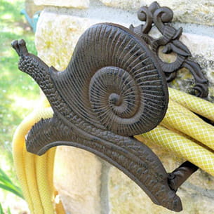 Pour faciliter l'accès et le rangement du tuyau d'arrosage, ce modèle "escargot" en fer forgé est à fixer sur la façade de la maison ou sur un mur d'allée.