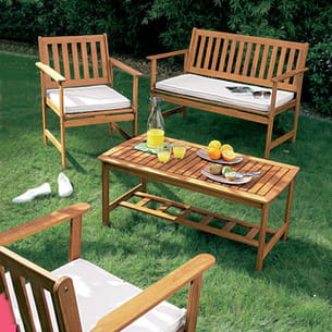 Un vrai coup de cœur : ce salon aux lignes simples, en acacia massif, a été recouvert d'huile de lin. Composé d'une table basse, de 2 fauteuils, d'un banc et de 3 coussins écrus, il étonne de sobriété et d'élégance. Son prix est également tout petit et comprend tous les éléments ci-dessus.