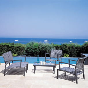 Original, tant sur la couleur que la forme, ce canapé est vendu avec deux fauteuils et la table basse assortie, recouverte d'un plateau en verre sablé. Les fauteuils et le sofa sont constitué d'aluminium laqué gris anthracite.