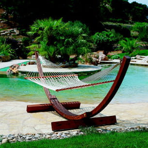 Propice à la détente et à la sérénité, le hamac Amanda meuble avec aisance et personnalité un jardin ou une terrasse. Il est aussi proposé avec un filet très pratique et confortable qui sera utilisé comme hamac transversal pour deux personnes. Le hamac Amanda est doté d'une structure en bois lamellé-collé, filet en corde tressée à la main et coussin.