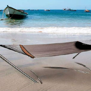 Ce hamac est idéal pour les farnientes au bord de l'eau : sa structure 100 % acier inoxydable nouvelle finition en et un repose pied en font le produit idéal qui ne s'abîmera pas, près de la piscine ou de la plage. La structure acier du hamac est livrée en 5 pièces à assembler.