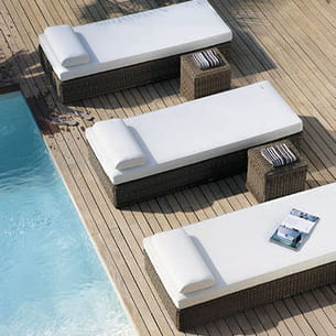Les abords de la piscine semblent avoir été créés pour se détendre. Pour changer des traditionnelles chaises longues et autres bains de soleil, n'hésitez pas à choisir un mobilier qui invite au farniente le plus complet. Les gammes actuelles proposent de nombreux modèles de lits et sofas d'extérieur, d'entretien facile, parfaitement adaptés aux aléas de la météo. Ensemble San Diego de Manutti.