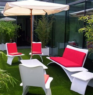 Pour ceux qui aiment le mobilier de jardin contemporain, ce sofa rouge et blanc d'Art'Mely devrait vous plaire. Outre ses lignes épurées, ses coloris punchis et ses formes ergonomiques, il offre une assise des plus confortables. Créés à partir de matériaux composites utilisés dans l'industrie marine, ce sofa résiste à l'épreuve du temps et des intempéries. Les matelas et coussins sont réalisés dans un tissu imperméable, résistant au UV, sel et chlore.