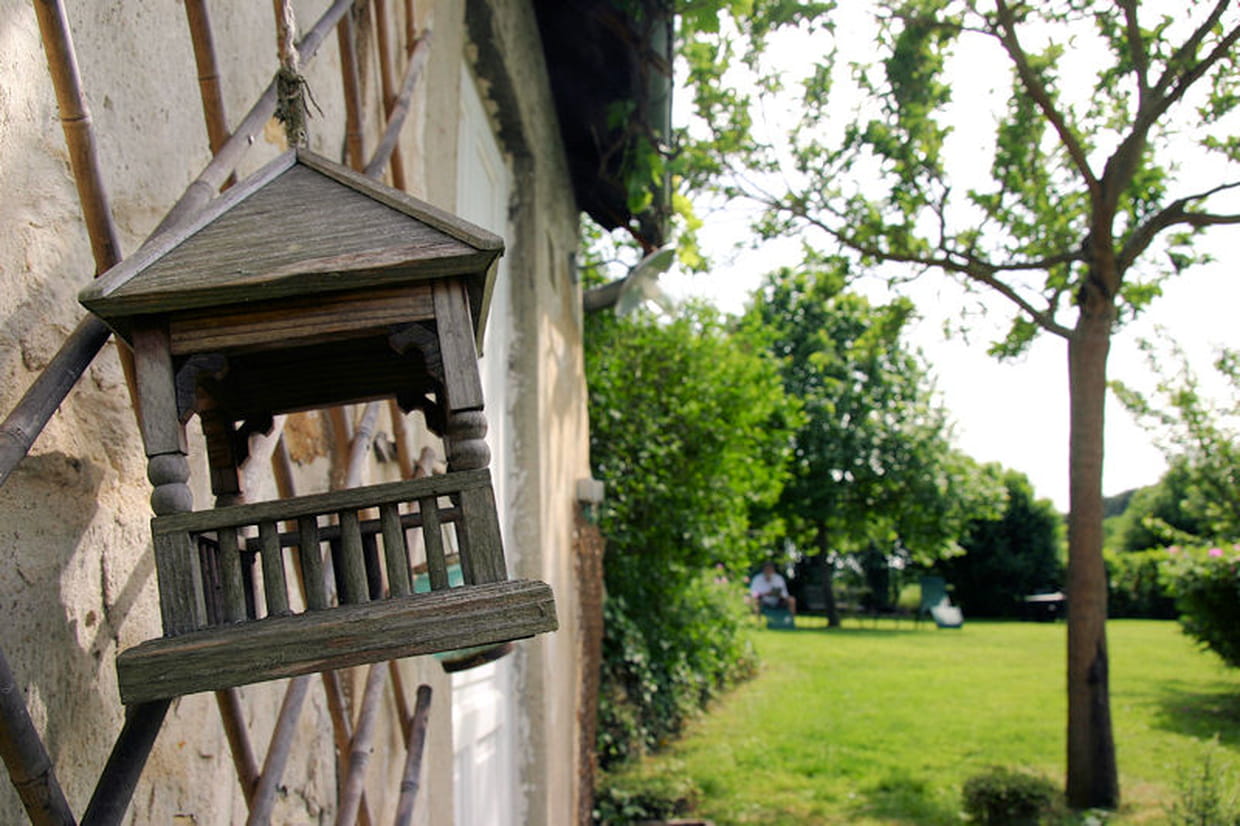 Derrière ce joli nichoir en bois, on peut apercevoir au loin, dans ce jardin verdoyant, un lecteur paisible.