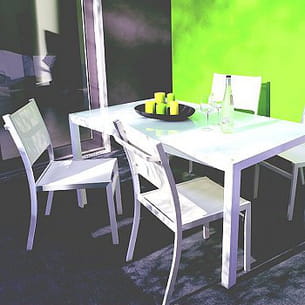Cet ensemble Caraïbes surprend par sa légèreté. La table en aluminium surmontée d'un plateau de verre est à la fois facile à déplacer et à nettoyer. Quant aux chaises, elles combinent la simplicité d'une assise en tissu et l'élégance d'un blanc uniforme. Elles sont empilables et existent également sous forme de fauteuil. L'ensemble comprend une table et quatre chaises.