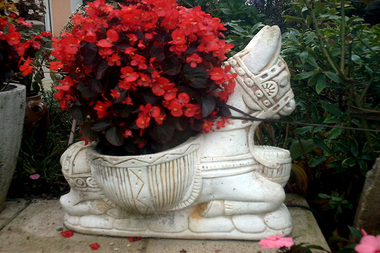 Marie-Claire possède de nombreuses fleurs : bégonias, dalhias, ou encore géraniums. C'est dans des contenants très originaux qu'elle a décidé de les installer. Qu'il s'agisse d'un cygne, d'un escargot ou d'un âne, tout ces petits animaux sont transformés en récipients fleuris.