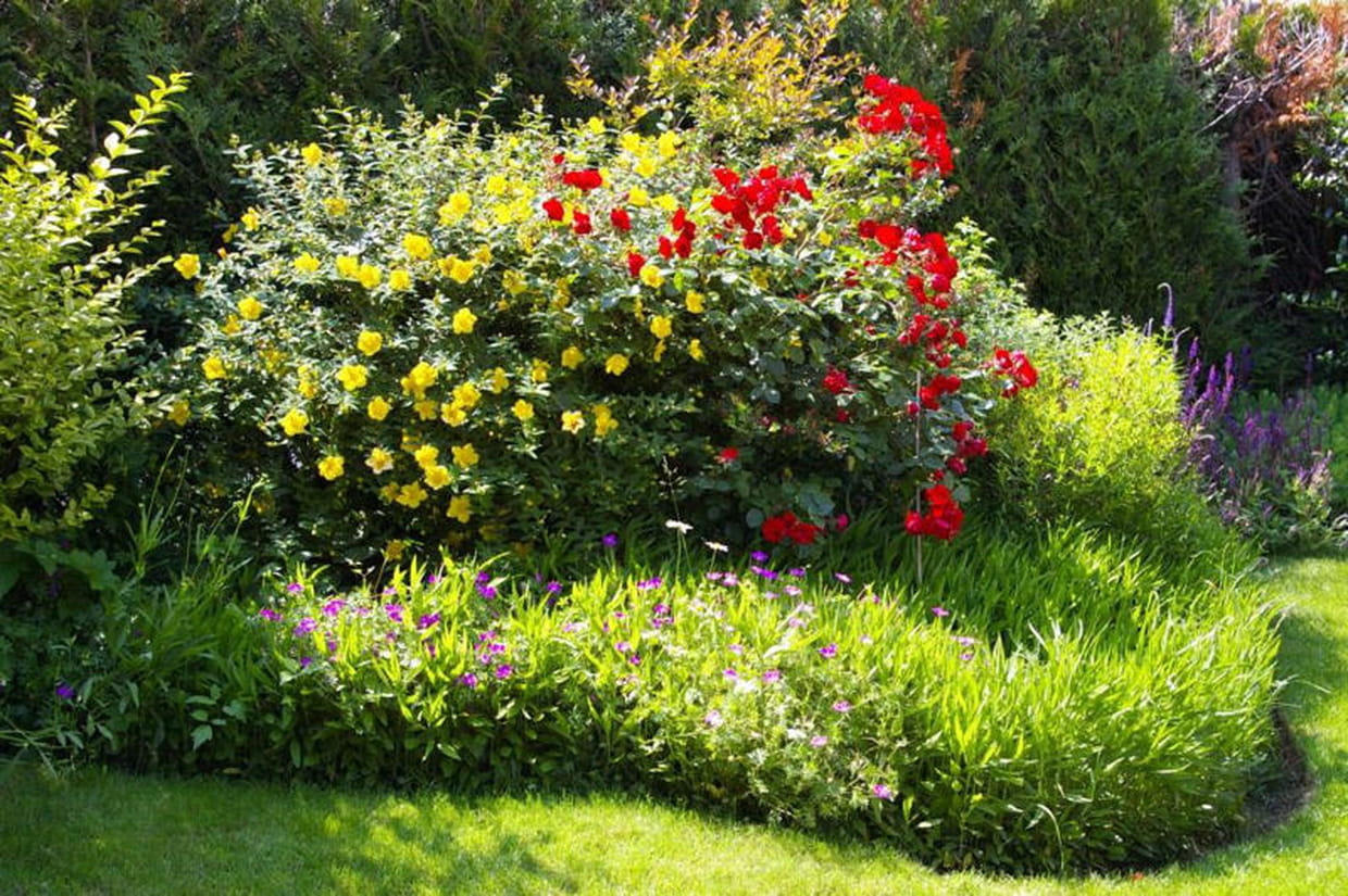 Et voici le plus ancien massif du jardin, ici en début de floraison, que les propriétaires ont planté à l'achat de leur maison. Il est entre autres fleuri de roses et de rudbeckias jaunes à coeur noir.