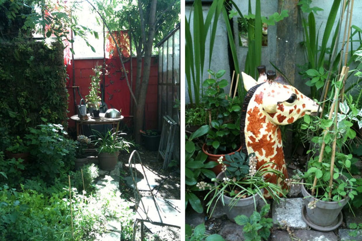 Parmi les pots de boutures diverses et de plantes aromatiques, trônent ça et là des sculptures de têtes d'animaux, comme cette girafe ou un rhinocéros bleu.