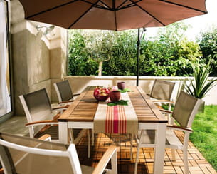 La nature est à l'honneur avec cette salle à manger de jardin : le plateau de la table et les accoudoirs des fauteuils sont en bois. Pour un jardin à la fois classique et contemporain.