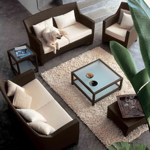 Le Salon Barcelona, signé Dedon, en résine tressée propose des lignes généreuses s'intégrant parfaitement à un intérieur épuré. Traité pour résister aux intempéries, il se transforme le temps de la belle saison en une invitation à la détente. La table, qui existe également en version repas, est dotée d'un plateau enchâssé en verre satiné. Plusieurs coloris sont disponibles.