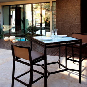 Composée d'une table mange-debout avec dalle de verre et de deux tabourets de bar, cette gamme s'intègrera à la perfection dans un intérieur contemporain. Divers coloris sont disponibles, autant pour la structure du mobilier que pour les toiles revêtant les tabourets.