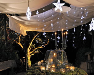 Les couleurs sont apaisantes, les étoiles rassurantes et les convives ravis. La réussite de ce repas en plein air n'est pas seulement dû à la composition du menu mais aussi au délicat rideau de lumière blanche flatté par la danse des étoiles baladées par le vent d'hiver.