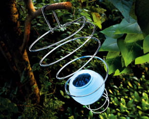 Voici une lampe solaire à la forme originale de spirale. Mobile, elle peut être déplacée et accrochée sans difficulté où on le souhaite : sur une branche, à la barrière du balcon, au parasol...