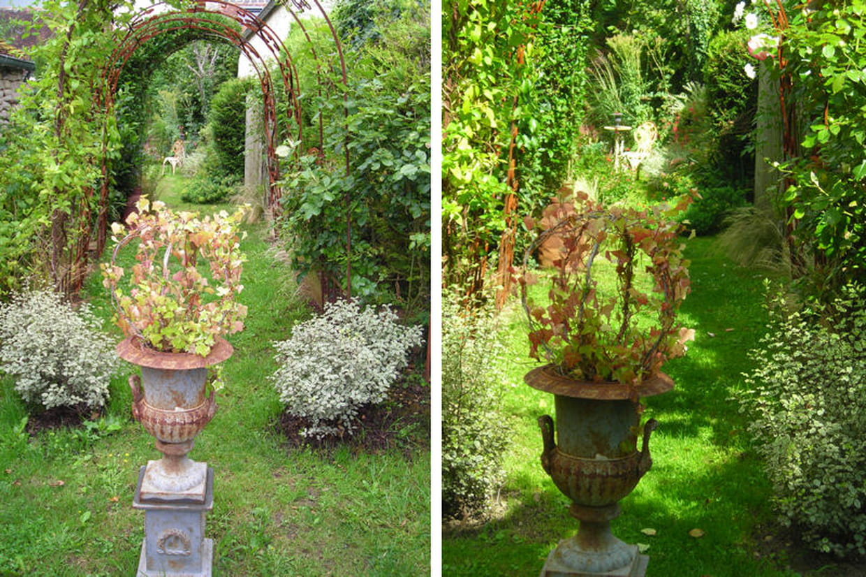 "Pour quitter le troisième jardin, contournons la vasque et dépassons les deux buissons en symétrie. Un petit salon de jardin blanc en fonte se dessine au fond et met en valeur les feuillages."