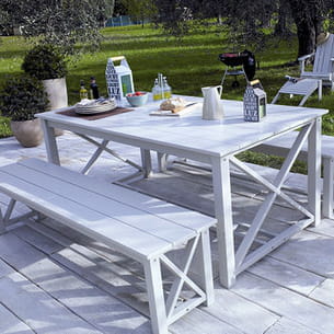 En bois de meranti, ce salon est constitué d'une table rectangulaire et de bancs. Il est recouvert d'une peinture acrylique polyuréthane grise. Et son achat est de plus un geste pour l'environnement puisque le bois est issu de forêts gérées durablement.