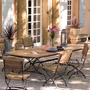 Ce salon de jardin est doté d'une structure en teck en en fer forgé. Le plateau rectangulaire est accompagné de deux allonges d'extrémité. Les chaises, parfaitement assorties, sont pliantes. La gamme propose également des fauteuils et une console coordonnés.