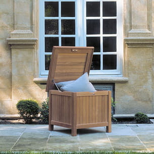 Idéal pour ranger les coussins lorsque la nuit tombe, les outils lorsque la séance de jardinage est terminée ou le matériel de piscine une fois la baignade finie. Aladin, coffre en teck avec ses joints en silicone, offre ce rangement indispensable. Il ferme à clef et est équipé d'une retenue de couvercle.