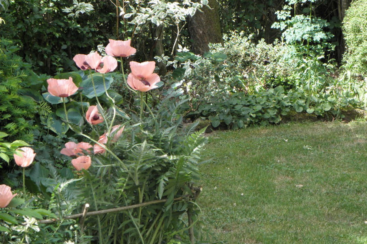 Comme ils sont délicats ces pavots rose saumon dont l'indiscipline est retenue derrière une petite barrière de branchage !