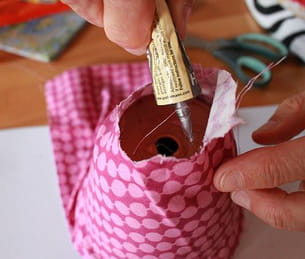 Découpez le surplus de tissu et rabattez le tissu restant sur le socle du pot. © Laetitia Devillars