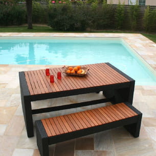 Table en résine tressée plateau bois avec 2 bancs. Le rêve chez vous © Le rêve chez vous