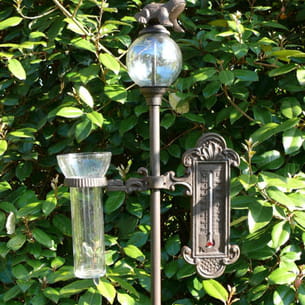 Thermomètre et pluviomètre sur pied. Histoire de jardin © Histoire de jardin