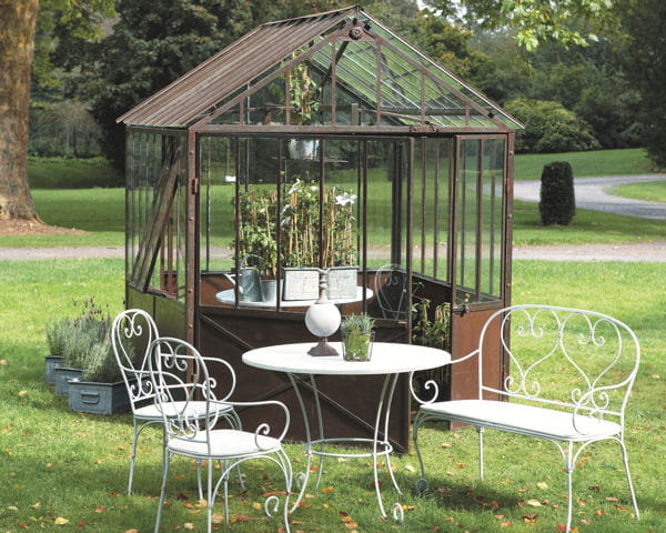 Pour un jardin 100% romantique, optez pour la serre Tuileries de Maisons du Monde. Le créateur Frédéric Tabary lui a conféré toute la noblesse des formes d'autrefois. Cette superbe serre sera encore plus jolie associée avec la collection Saint-Germain : trois pièces classiques en fer forgé, à la fois élégantes et féminines.