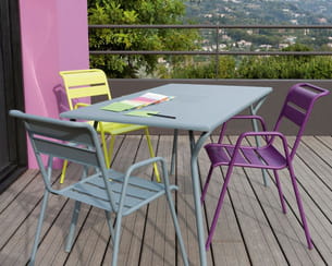 Si vous aimez mixer les couleurs, vous serez servies avec la collection Monceau de Leroy Merlin par Fermob. Autour d'une table design gris orage en acier électrozingué, ajoutez des chaises couleur verveine et aubergine pour un résultat à la fois doux et coloré.