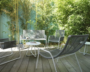 Chez Castorama, c'est la détente assurée avec le salon Finey. Grâce à sa structure en acier recouverte de corde élastique, vous serez aux anges lors de vos siestes à l'ombre. Canapé, fauteuil, table basse et fauteuil de détente : la collection présente un bel assortiment de meubles rafraîchissants.