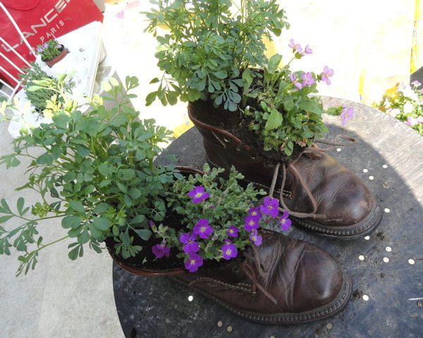 Les boots pots de fleurs en version violette © Dominique Rowe