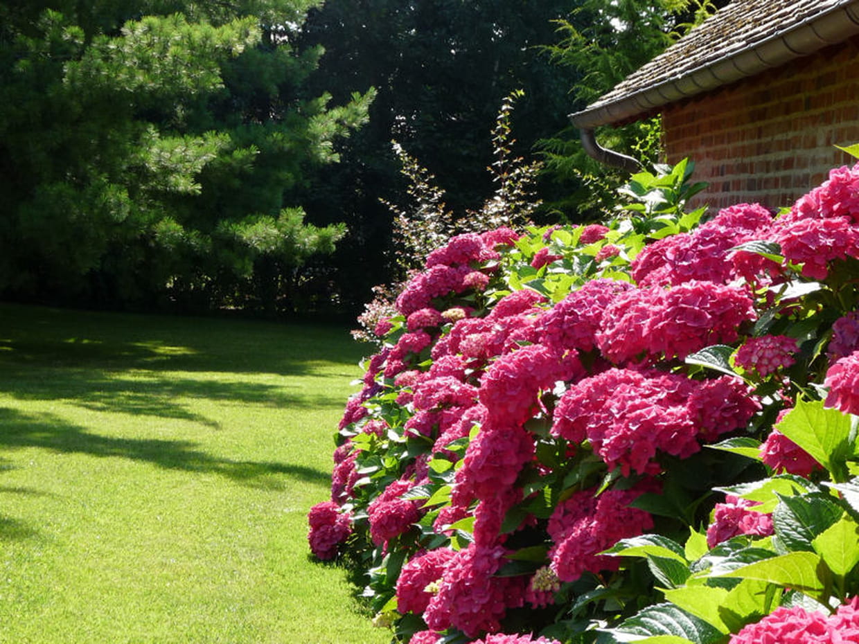 Pour donner plus de vitalité au jardin, les massifs d'hortensias foisonnent librement le long de la façade et apportent une touche colorée à cette longère.