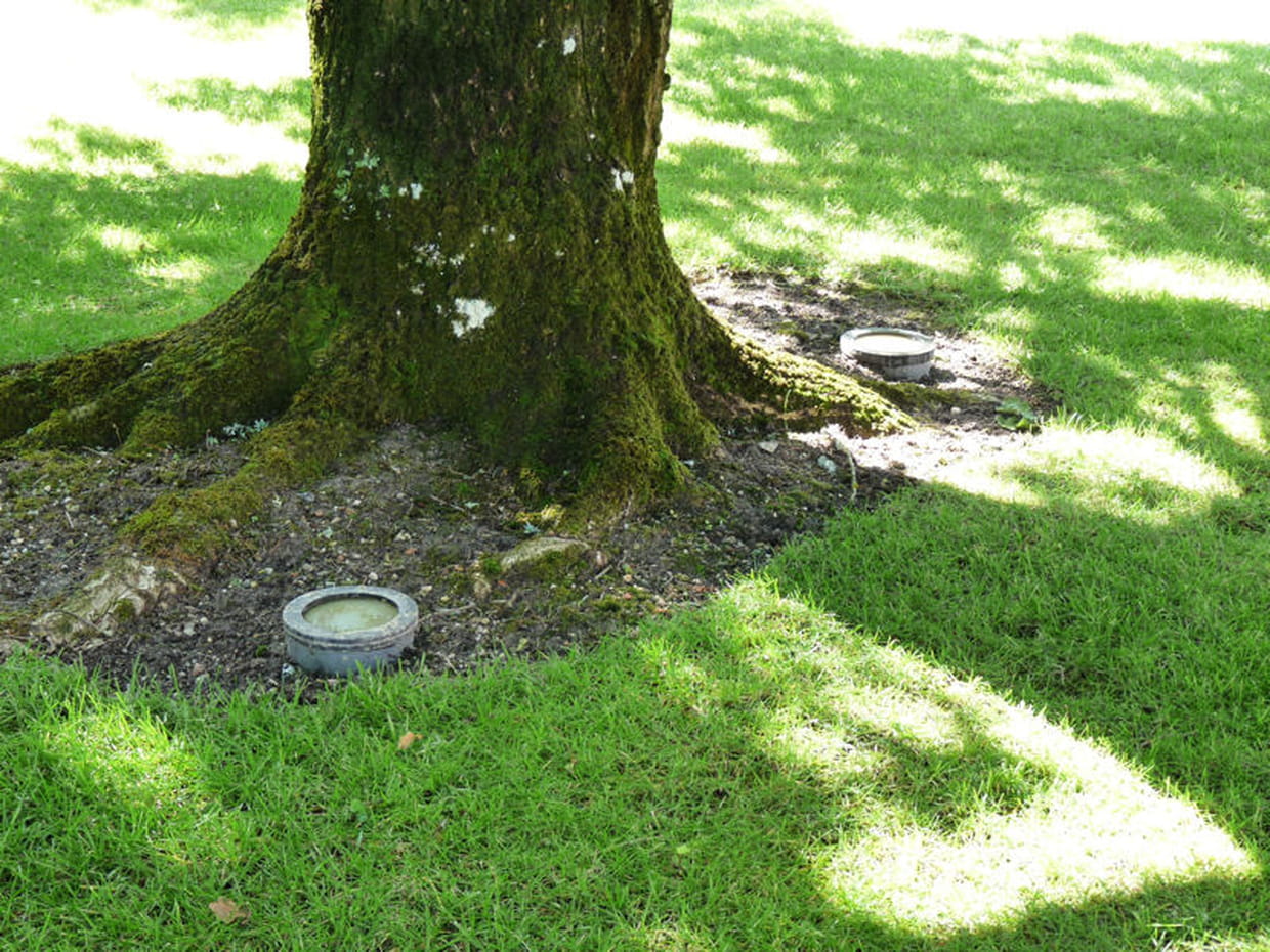 Les propriétaires étant des amoureux du golf, un travail minutieux a été effectué sur le gazon qui ressemblerait presque à un pratice tant il est bien entretenu. Au pied du chêne, deux luminaires ont été implantés pour éclairer le jardin la nuit tombée et créer des effets lumineux.