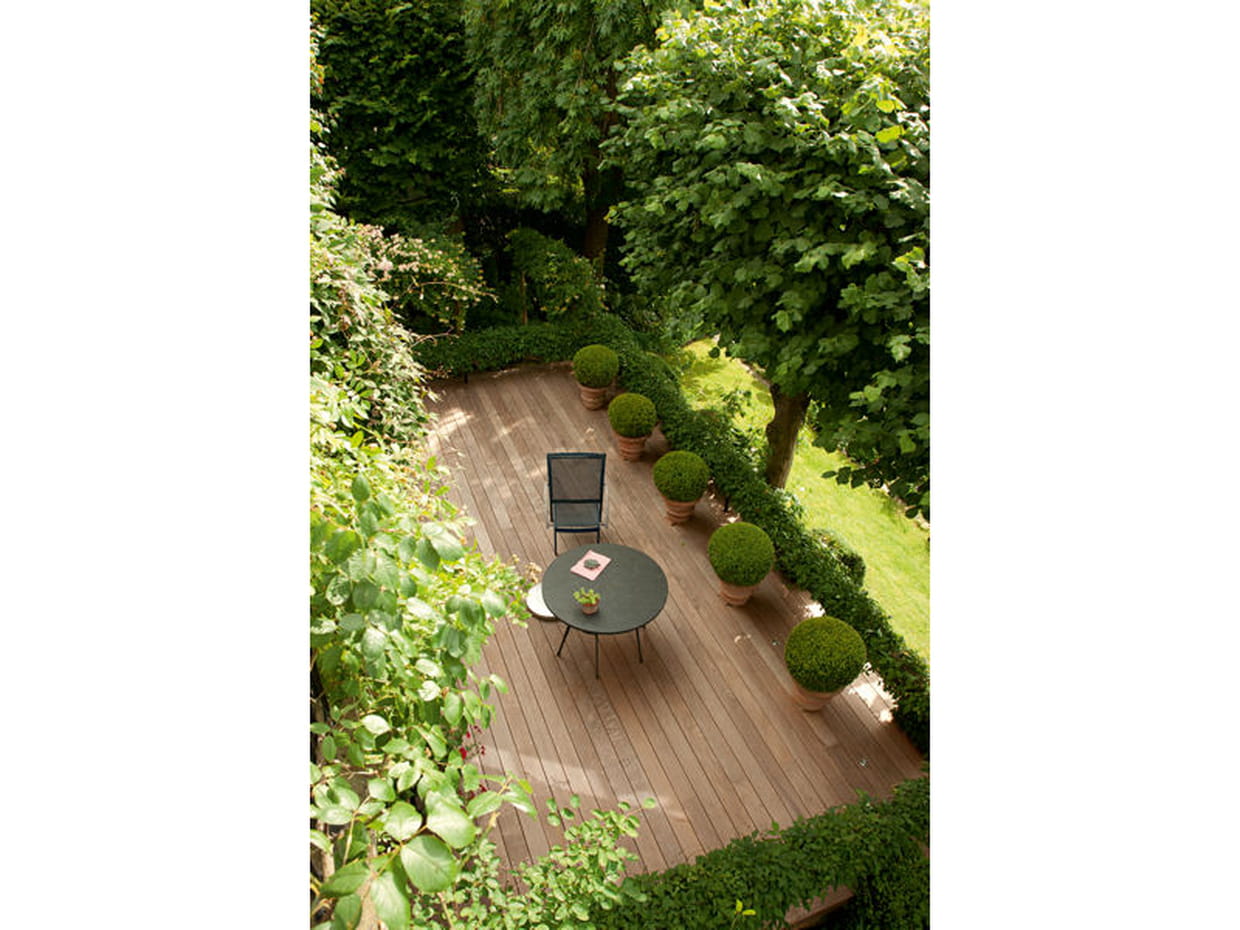 Vue de haut, la terrasse, bordée par la clématite, se présente comme un petit belvédère surplombant le jardin en pente. Du buis taillé en boule apporte une touche élégante à cet espace de détente.