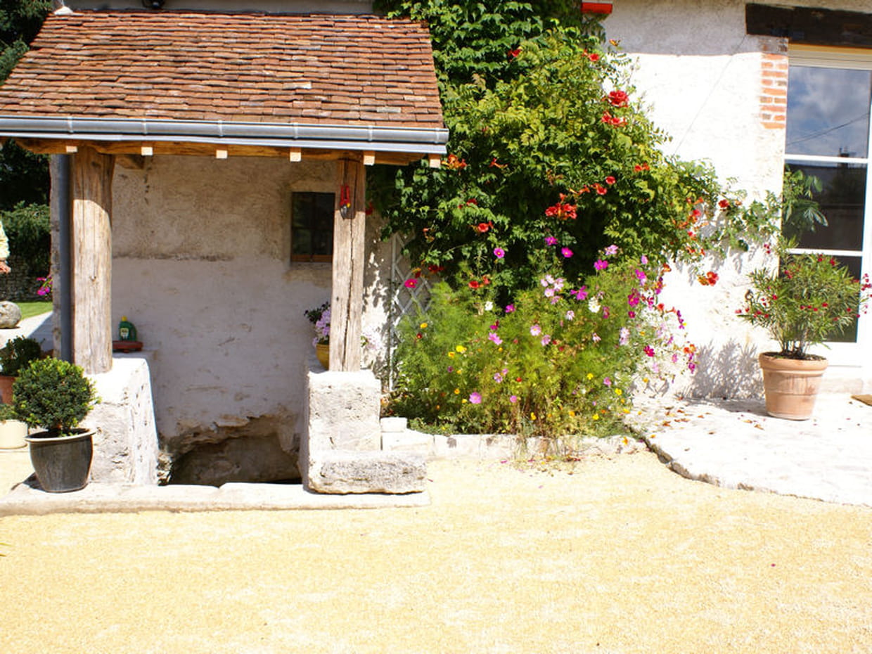 Ici, c'est une bignone qui court le long du mur, entremêlée avec de la vigne vierge et quelques fleurs des champs, créant une composition bucolique et colorée. Sous l'auvent, un escalier permet d'accéder à la cave de la maison.
