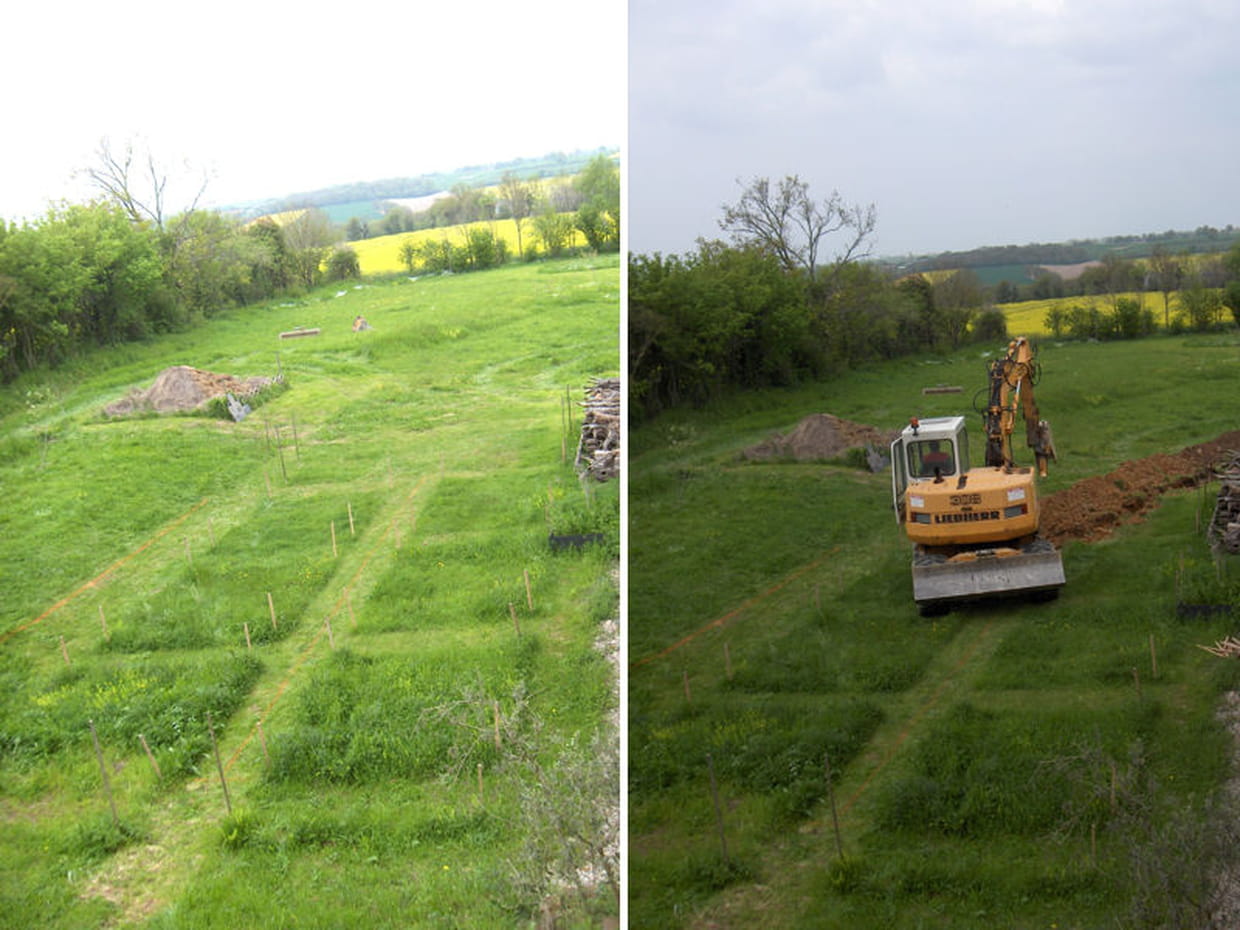 C'est grâce à un vrai travail de recherche et d'étude de manuscrits enluminés, de tapisseries d'époque et de tracés de jardins de cloîtres que Pierre a pu définir les contours de son futur jardin. Quelques passages de tondeuse à gazon plus tard, les allées et le dessin du jardin apparaissent. Mais suite à différentes analyses de la terre, il a fallu poser un drain pour favoriser l'élimination de l'eau de ce sol très argileux.