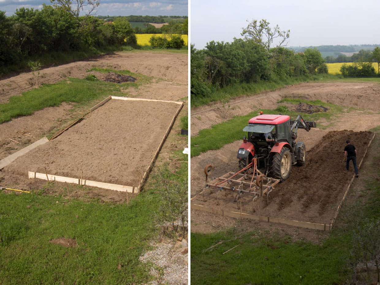 A certains endroits du sol, le schiste ardoisier affleurait ; il a donc fallu ajouter de la terre pour favoriser la plantation de végétaux. Des planches de chantier de 20 cm de hauteur et 2,5 cm d'épaisseur non traitées délimitent le jardin et maintiennent la terre apportée. Ces planches ont été remplacées au bout de cinq ans par des poutres traitées de 20 cm de hauteur et 7,5 cm d'épaisseur. Puis, suite à un léger tassement, la terre a dû être labourée afin d'accueillir les premiers végétaux du futur jardin. Parallèlement, Pierre a décidé de conserver des espaces naturels pour accueillir la biodiversité et pour créer d'autres petits jardins. Cela a permis aussi d'affecter une partie des prairies aux animaux qui sont représentés sur les enluminures (âne, chèvre, moutons) et de laisser les volailles en liberté comme au Moyen Âge.