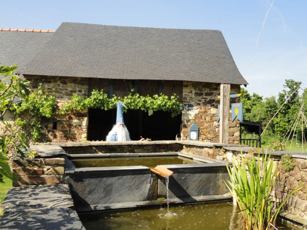 Un vieux bâtiment dont il ne restait que les fondations a été transformé en vivier à poissons. Pour ce faire, des dalles de schistes récupérées recouvrent les murs. De la bâche de bassin est utilisée à l'intérieur et une dalle de schiste, provenant d'un ancien urinoir, sert de séparation entre les deux bassins. Une pompe remonte l'eau du bassin bas vers le bassin haut et le trop plein s'écoule par une tuile, créant un bruit de fontaine apaisant.