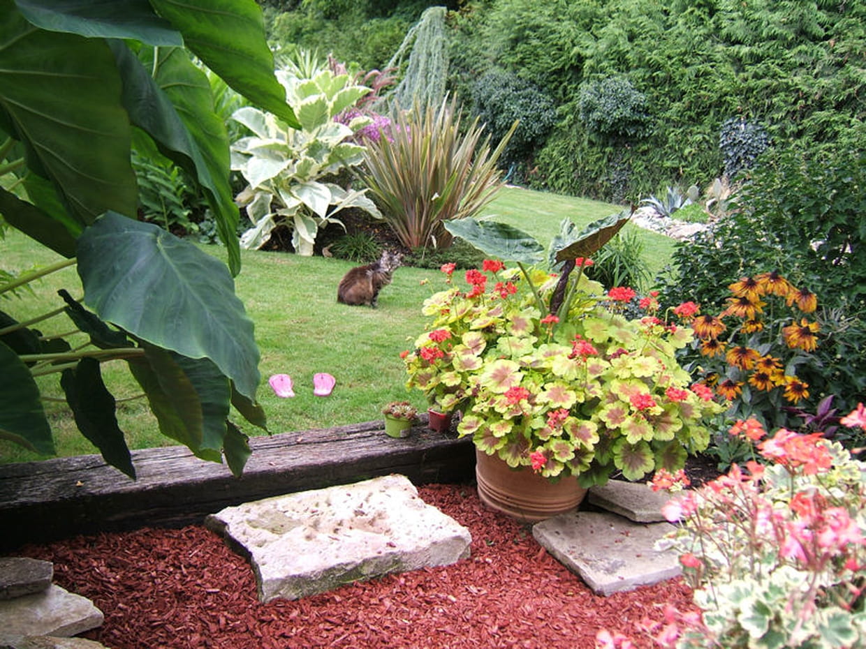 Même le chat prend un malin plaisir à se promener dans les allées de ce jardin d'agrément ! Géraniums en pots et copeaux de bois rouges parcellisent l'espace. Pour ceux qui voudraient y faire un tour, le lieu est à son apogée au mois de septembre.