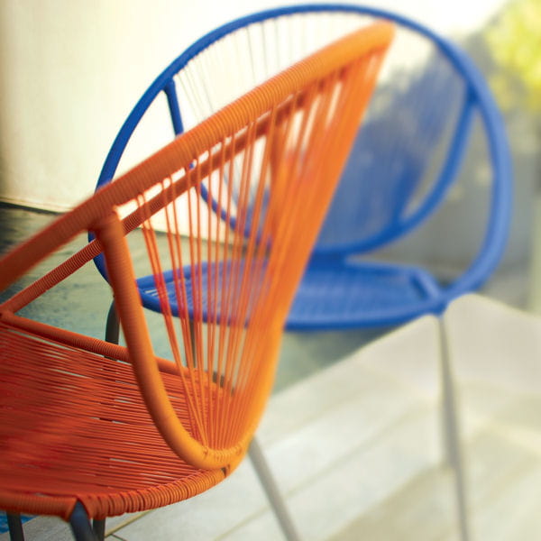 Ce fauteuil de jardin se compose de pieds en acier noir mat et d'un dossier tressé en plastique orange ou bleu vif. Dans le jardin, il constitue une jolie touche rétro.