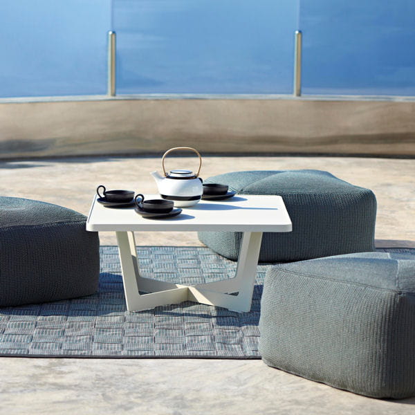 Les poufs carrés anthracite sont tricotés à la main au crochet. Conforts et légers, ils sont idéals pour profiter du jardin en toute quiétude. La table basse carrée en aluminium est hautement résistante.