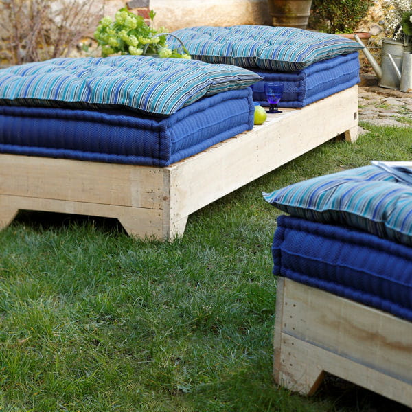 Epais, ces coussins promettent une assise confortable. Le must : sa couleur bleu vif, une des tendances phares cet été.