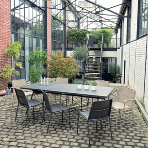 Ce mobilier de jardin aux lignes contemporaines et élégantes a été créée par le designer Christophe Pillet. Il est hautement résistant et s'adapte parfaitement à l'extérieur.