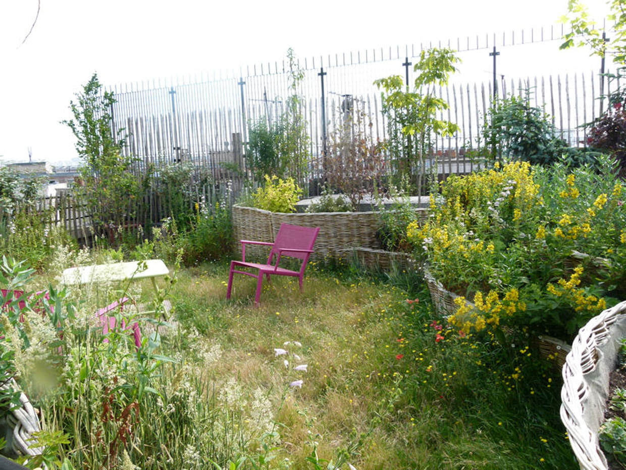 A Paris, le dernier étage d'un immeuble assez haut réserve une belle surprise : un toit-terrasse aménagé comme un jardin de campagne, authentique et en relief. C'est l'oeuvre du paysagiste-"compositeur de nature" Alexandre Tonnerre, créateur de l'agence Opus Paysage. Ses clients, sensibles à l'écologie, recherchaient un aménagement naturel pour leur espace vert. Dans ce jardin d'environ 100 m² en forme de U, on trouve une partie en couloir et deux espaces plus carrés, l'un destiné au potager, l'autre à un jardin de détente.