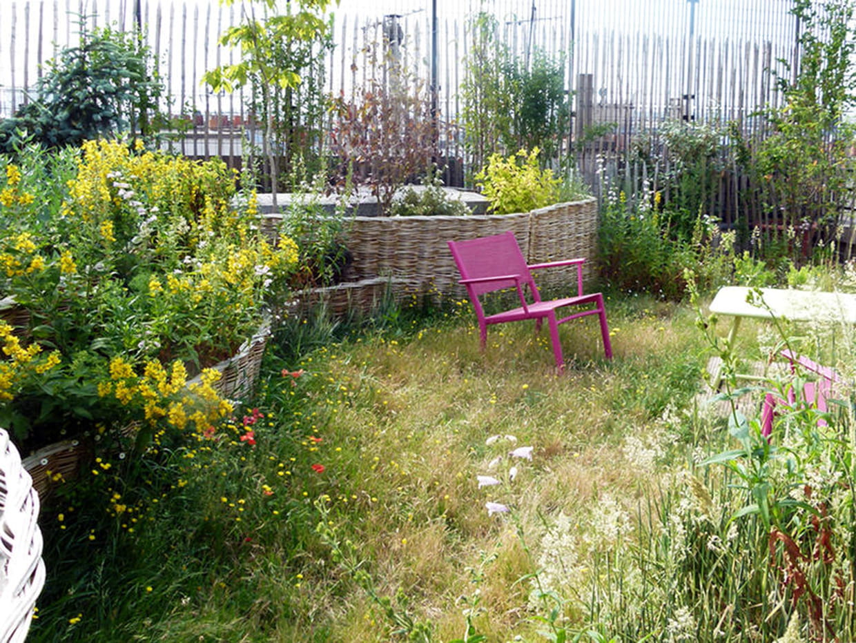 La plupart des vues depuis la terrasse ont été fermées par des barrières en bois sur lesquelles viendront pousser des grimpantes. Certaines vues ont tout de même été gardées afin de créer l'effet de surprise : dans cet îlot de verdure façon jardin de campagne, on se rend compte, au détour d'un massif, que l'on est finalement en ville ! Dans cette partie du jardin, l'espace a été engazonné mais à la façon d'une prairie plein d'herbes folles. L'apport de terre au niveau du sol n'a pas été nécessaire puisque la terrasse avait déjà été pensée comme un jardin à la construction du bâtiment.
