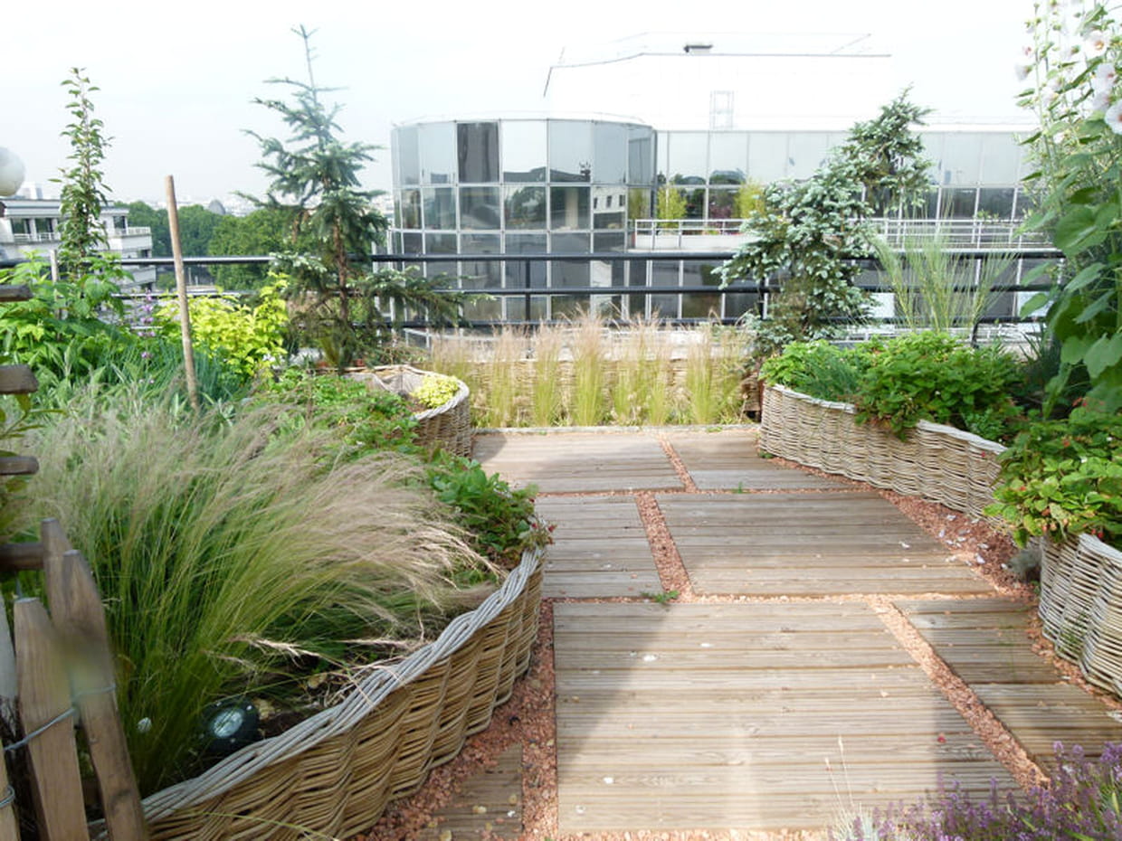 Cette partie en couloir est aménagée, au sol, de planches de bois et de briques pilées. Dans ces brisures de briques, le paysagiste a laissé la nature faire son oeuvre et quelques plantes sauvages pointent leur nez. Au bout de ce chemin de bois, deux épicéas bleus, séparés par des graminées, affichent des formes quelque peu tordues. Dans ce jardin, les plantes formatées et taillées au cordeau n'ont pas leur place.