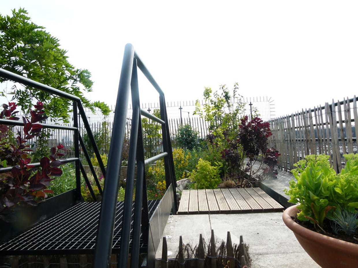 L'architecture du bâtiment impose naturellement du relief à ce jardin-terrasse : il faut jongler entre les cheminées et les différents blocs de climatisation qui ponctuent le toit de l'immeuble. Une passerelle noire pré-existante permet d'aller d'un point à l'autre de la terrasse. Avec le temps, celle-ci sera surmontée par les branches d'un poirier à feuilles argentées (planté à gauche), une espèce d'arbre pleureuse.