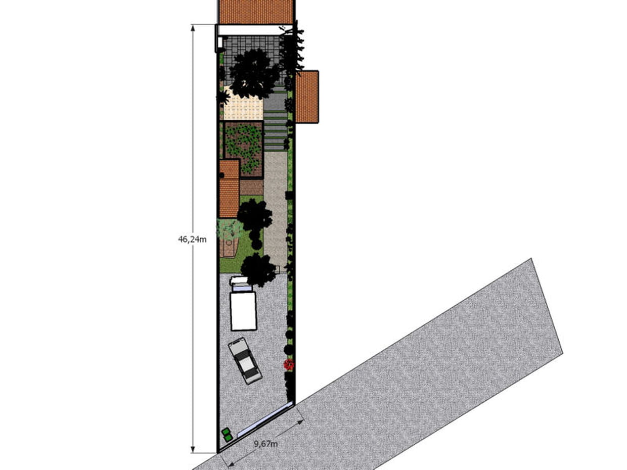 La forme un peu particulière du terrain ne donnait pas des possibilités infinies d'aménagement. De plus, la nécessité de conserver l'accès au garage, ainsi que le cabanon, restreignaient encore les choix. On voit bien sur ce plan l'allée réservée aux véhicules qui a remplacée l'une des bordures.