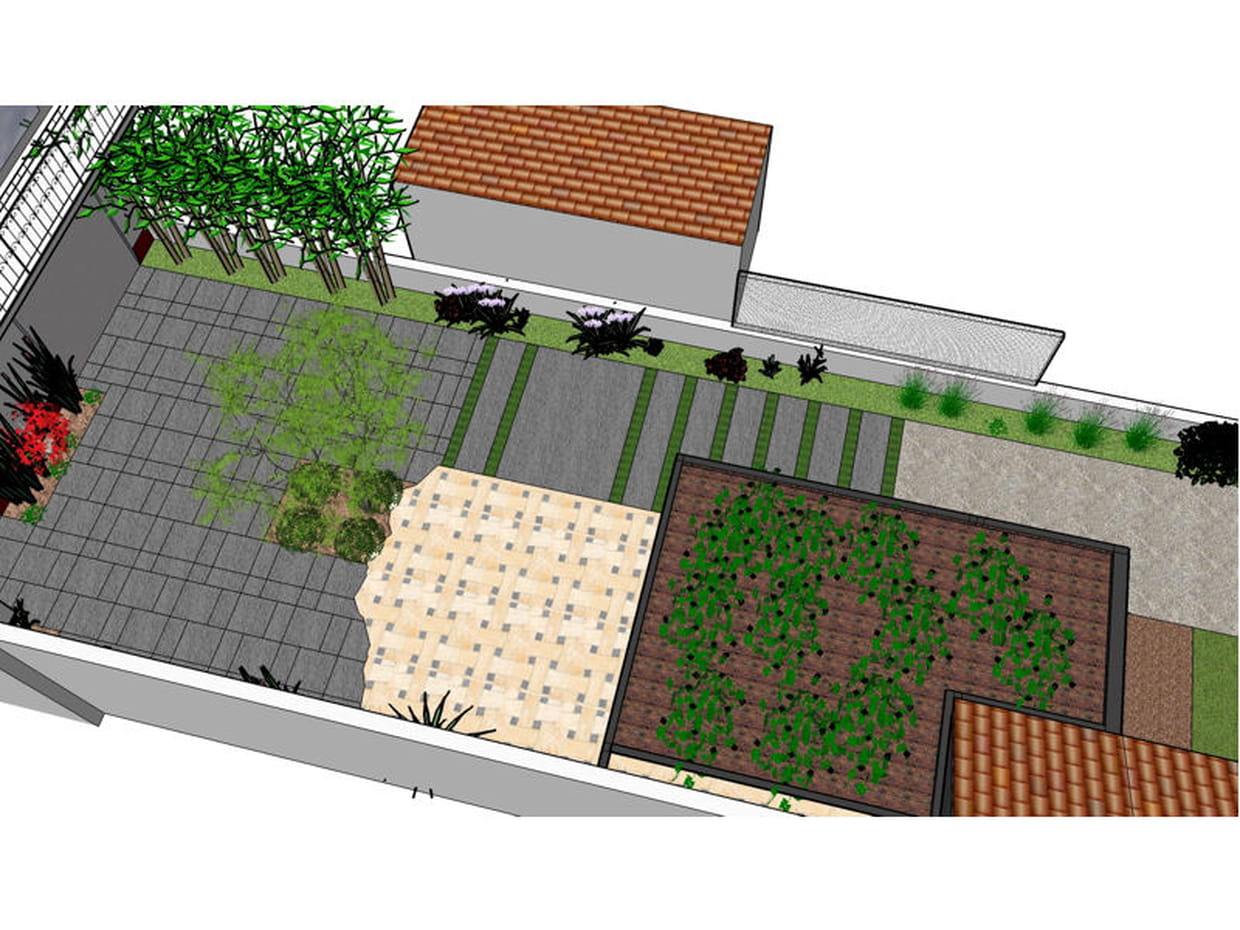 Afin de bénéficier d'un emplacement réservé aux repas, au barbecue et à la détente, un dallage particulier a été installé. Il délimite la terrasse et se différencie du second dallage, plus foncé, qui délimite l'espace de passage. Le couple souhaitait que la terrasse soit ombragée. Une pergola végétalisée a donc été installée, afin de créer un endroit intime tout en élégance.