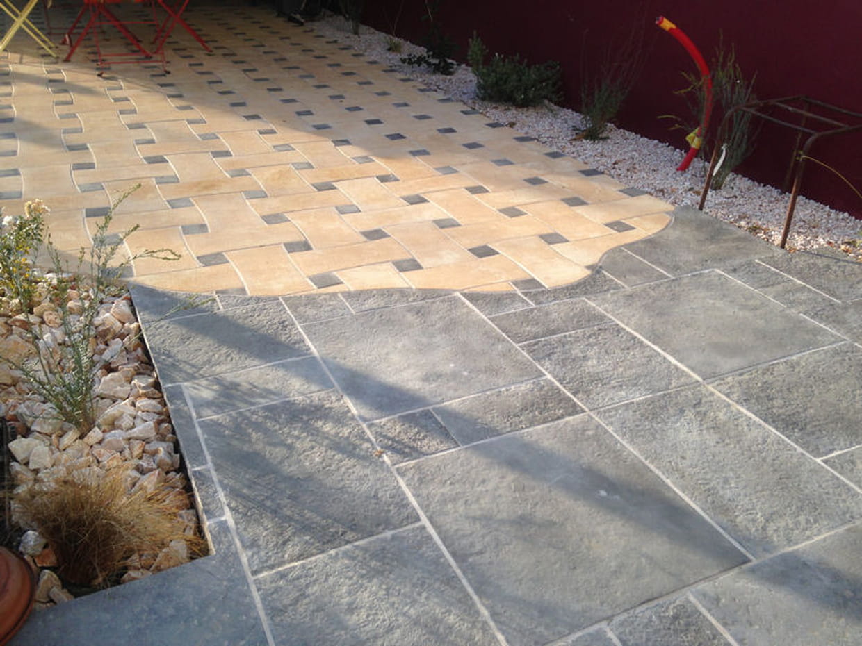 Deux dallages différents permettent de délimiter clairement les surfaces : l'espace de passage et le coin repas. Il s'agissait de créer une terrasse originale et qui ne soit surtout pas monotone en l'absence de végétaux. La couleur gris claire des dalles de béton Lyas coloris Armor, forment un rappel avec les cabochons des dalles Deauville, plus claires. Afin de ne pas créer de rupture trop nette entre les deux dallages, une transition irrégulière a été réalisée afin d'apporter un effet naturel et de donner l'impression que le revêtement a été toujours été là.